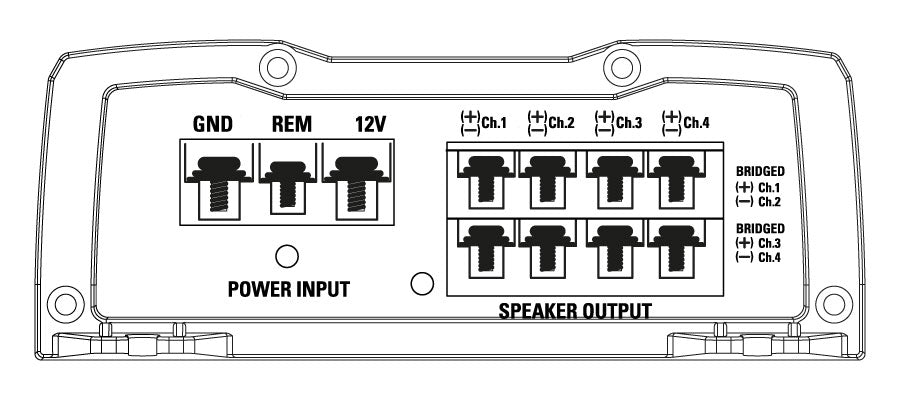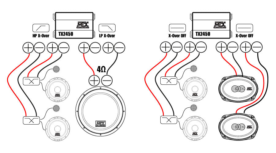 The MTX TX2450 amplifier is powerful and very flexible. It can power up 4 speakers (2Ω~8Ω) at the front, at the rear. Another example, it can power up the 2 front speakers plus a subwoofer. In any case, it shines with its legendary dynamics and exceptional musicality. The variable active filter allows it to be extremely precise: 12dB/oct high pass or variable low pass from 50 to 120Hz. If you don't know where to start adjusting the active filter, the potentiometer is equipped with an 80Hz "click" position. To avoid interference problems, we have equipped the TX2450 with balanced inputs. They perfectly isolate the audio ground of the amp so that it does not mix with the noisy ground of the power supply. This is a powerful technique that is usually found on high end amps. If your car stereo does not have RCA outputs, you can connect the TX2450 to the high level inputs. All you need to do is connect the factory speaker output cables directly to the high level input of the amplifier. Simple yet very practical.