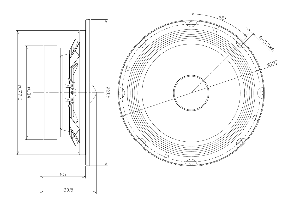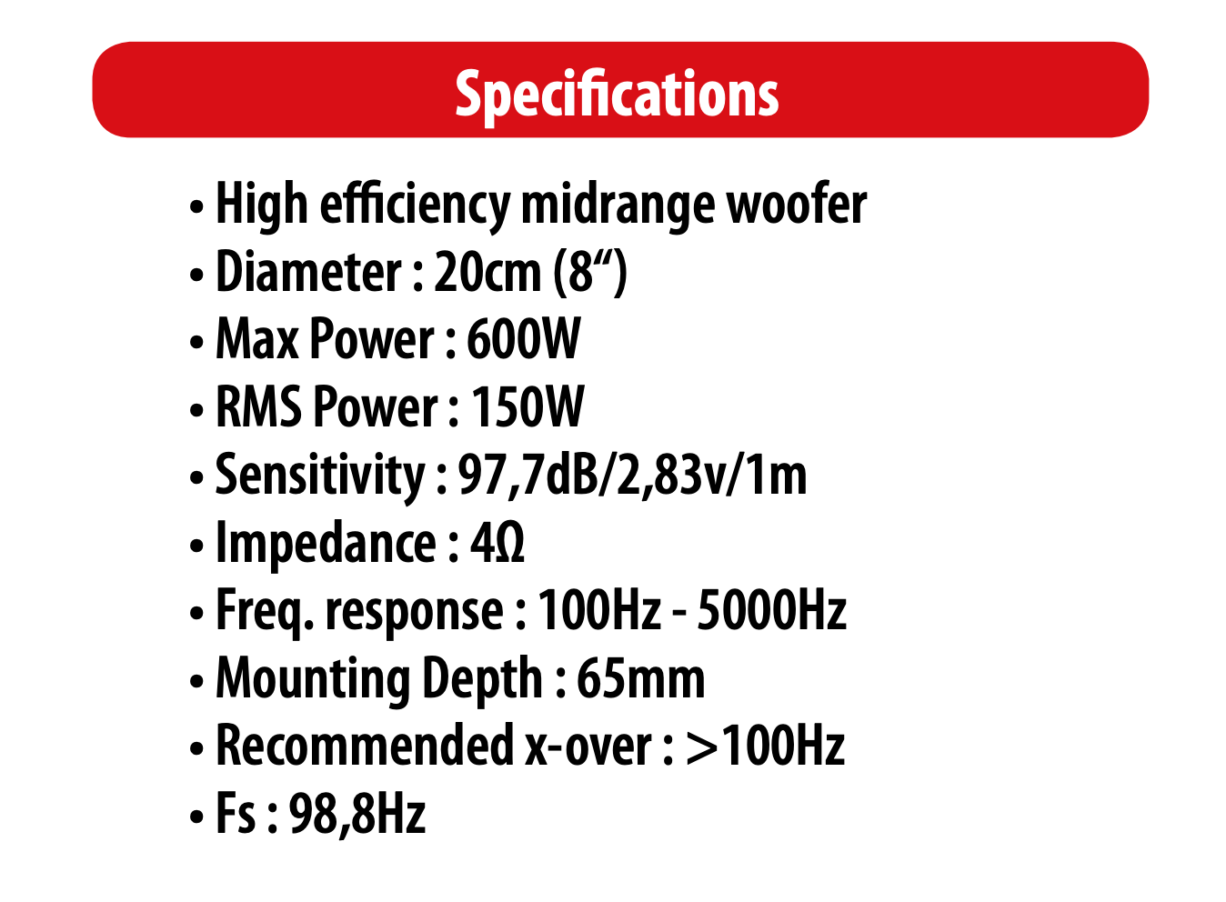 The MTX RTX84 midrange is a 20cm (8”) high output loudspeaker. With very little power, it reproduces a lot of sound. These mid-bass drivers handle 150W RMS with an efficiency over 97dB. Intended for SQL installations and open door sound systems. The sound is very powerful and live. It shines with a striking realism, softness and exceptional musicality. Despite its very high efficiency, it is never brutal or aggressive. Its large 38mm coil, its aluminium phase plug to fight against standing waves, its extra large magnetic structure (Ø134mm), its fabric suspension and its pressed paper cone are all assets that help with the sound quality and transducer performance.